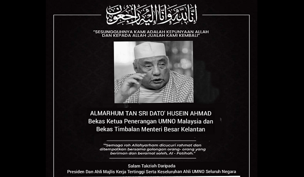PASIR MAS,13 September-Bekas Ketua Penerangan UMNO,Tan Sri Hussein Ahmad,90,meninggal dunia akibat sakit tua di rumahnya dekat Kampung Lemal di sini pagi tadi.