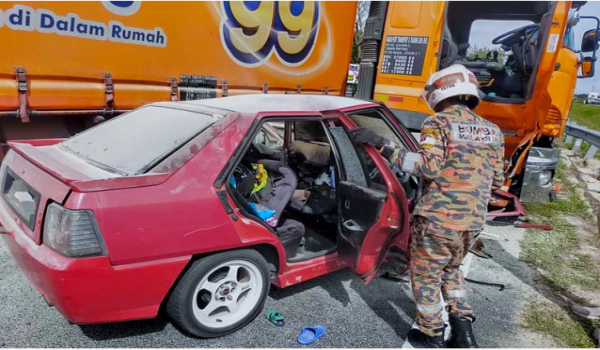 Insiden itu menyebabkan kereta dinaiki mangsa yang berada di lorong kanan laluan,merempuh sisi depan treler tersebut.