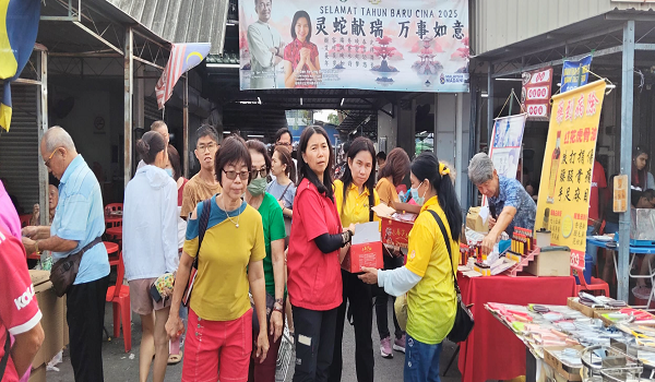 ADUN Indera Kayangan Gan Ay Ling menyantuni orang ramai pada Program Sumbangan Limau Mandarin dan Sampul Angpau Tahun Baharu Cina