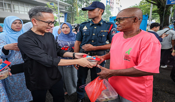Menteri Komunikasi Datuk Fahmi Fadzil mengedarkan kurma dan bubur lambuk ketika melawat bazar Ramadan di Bazaria Pantai