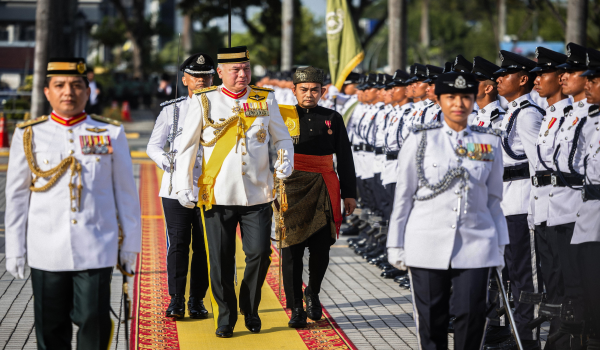 Sultan Perak,Sultan Nazrin Shah berkenan memeriksa perbarisan kawalan kehormat pada sambutan Hari Pahlawan 2025 Negeri Perak di Bangunan Perak Darul Ridzuan / Foto Bernama